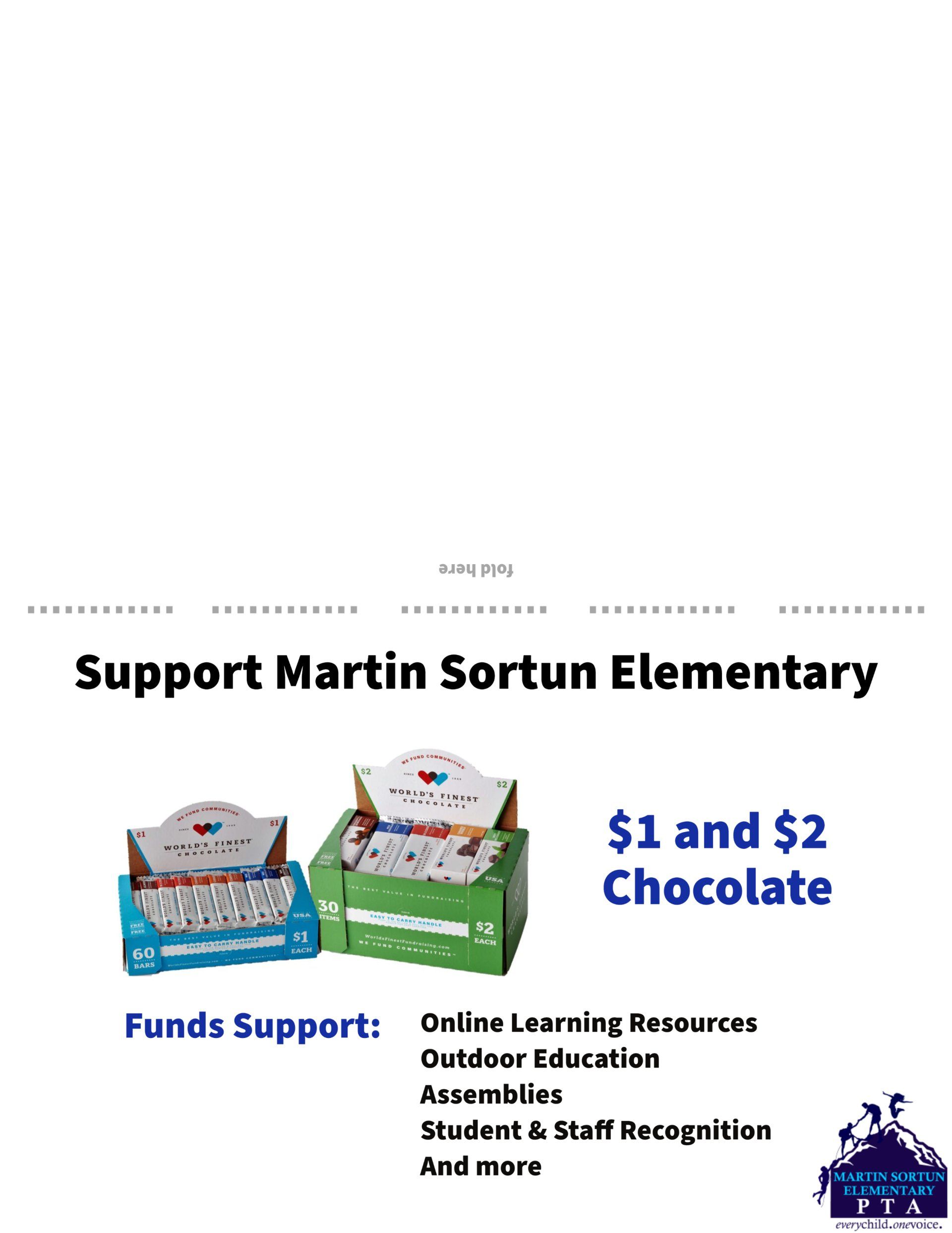 As a parent/guardian, you can pay for the box outright if you'd like, and sell the chocolate in your own time or keep it for yourself (yum). You can return the envelope in your chocolate box with cash and check (make checks out to Martin Sortun PTA) or you can pay for the box online (fees apply).
