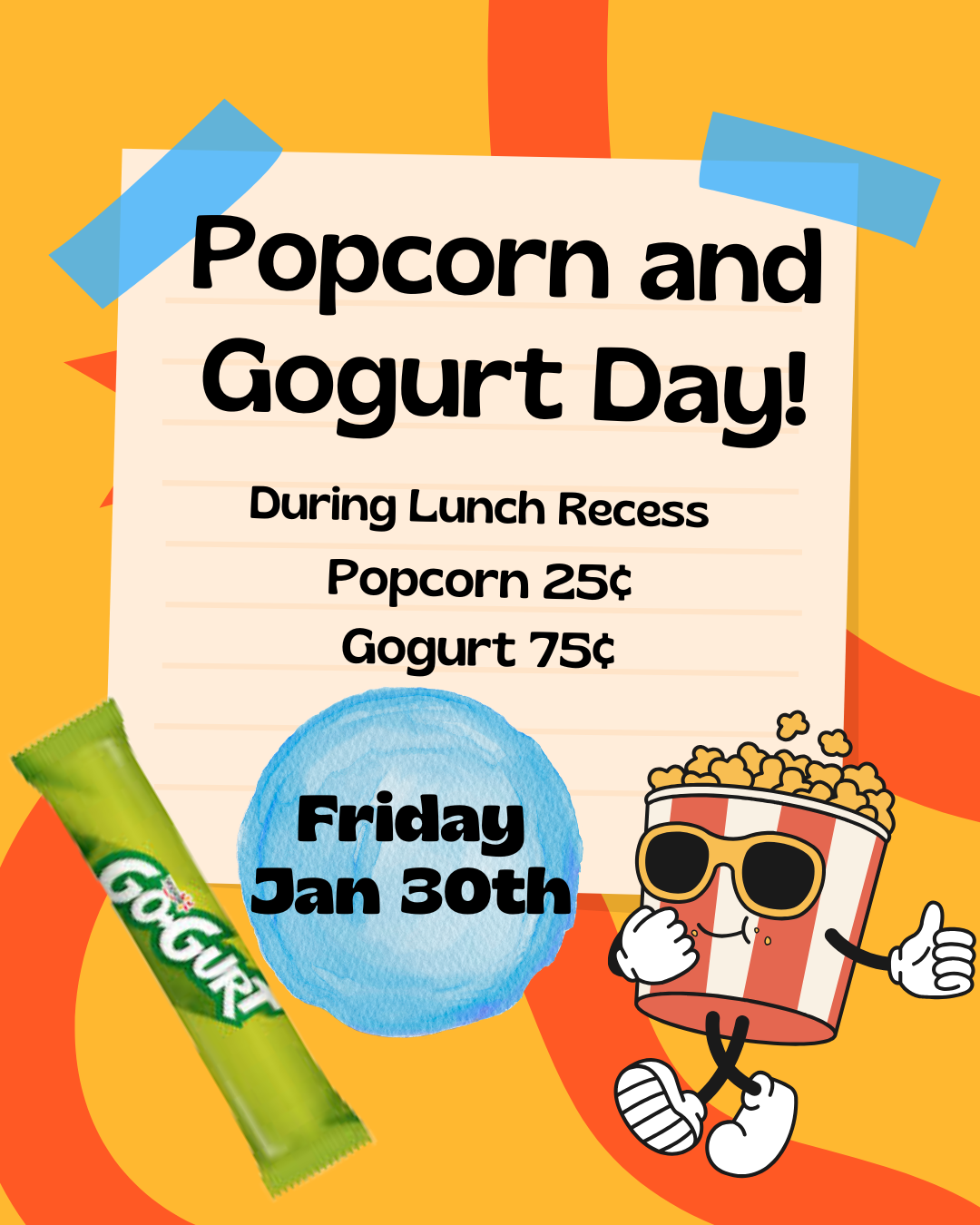 Popcorn & Gogurt day is January 30th! Students will be able to purchase popcorn for .25 and/or tubes of Gogurt for .75 during their lunch recess. Looking to volunteer? Sign up HERE!