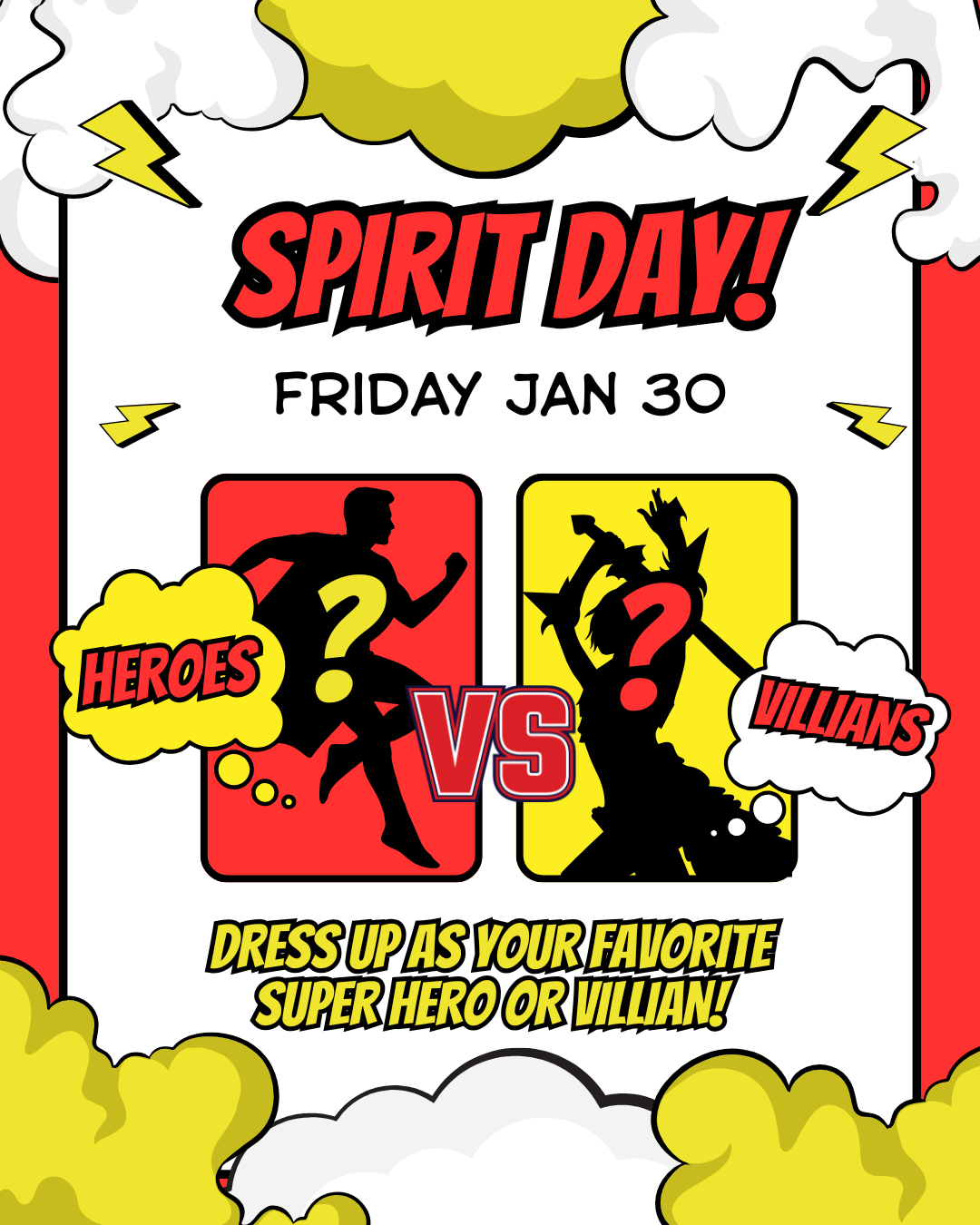 Our next spirit day is Jan 30th. Come dressed as your favorite super hero or villain. Spirit days will coincide with the last school day of the month and the 3B assembly that day! (please no masks or weapons).